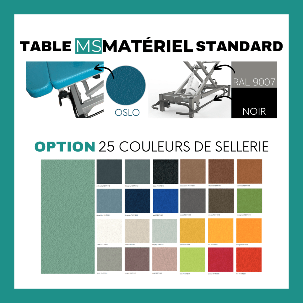 Durabilité et garantie sont les critères clés, surtout avec une utilisation intensive : Pensée pour une utilisation intensive, la table MS Matériel est dotée d’un revêtement haut de gamme, résistant aux désinfectants, fluides corporels, huiles et à l’abrasion. Son châssis en tubes d’acier assure une durabilité exceptionnelle, le tout couvert par une garantie de 24 mois.